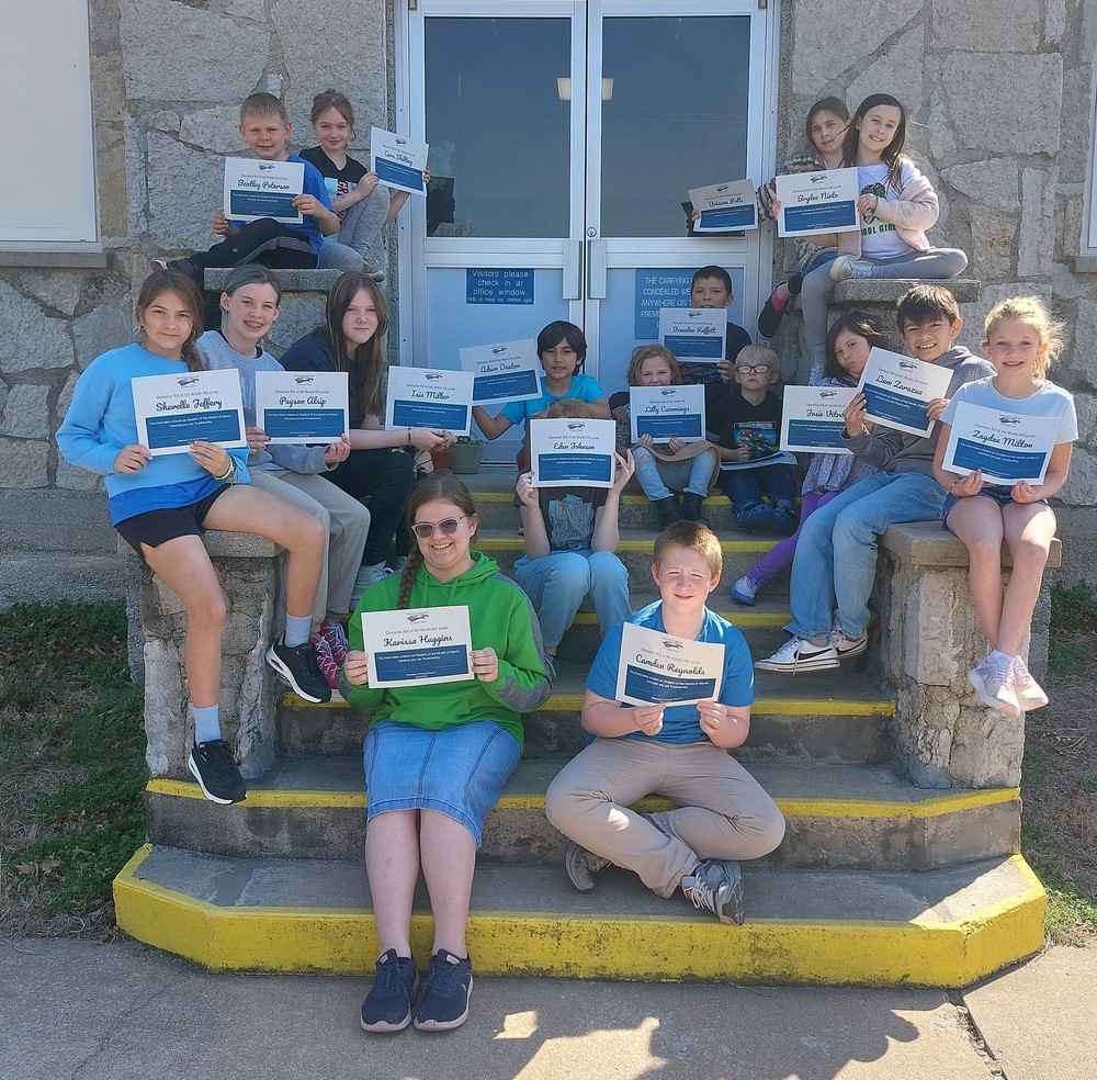 Front row, left to right: 3rd grade Coraline Putney, 2nd grade John Carroll Back row: 2nd grade Brecklyn Rawlins, 3rd grade Lucas Chartier, 4th grade William Johnson, Kooper Rear...
